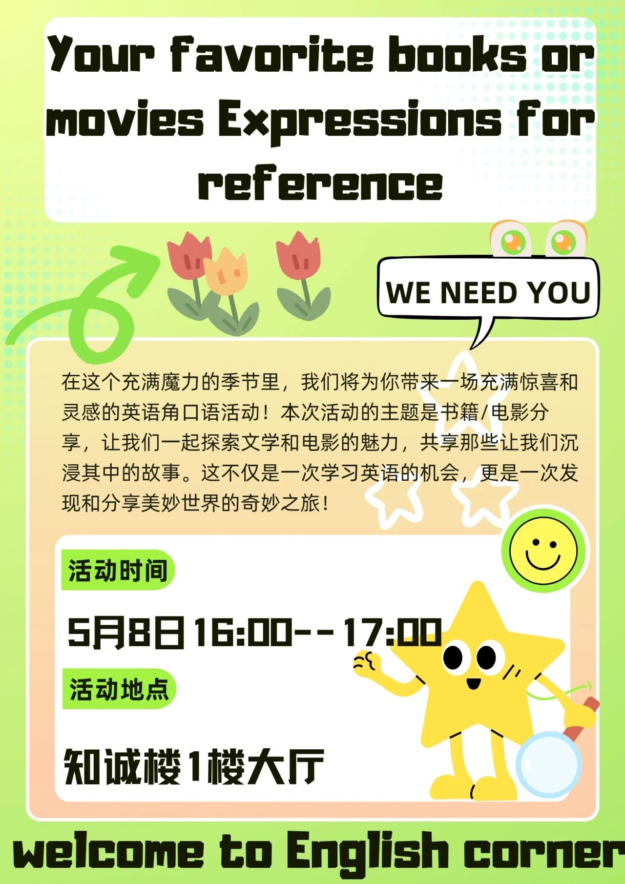 让我们一起探索书籍和电影的魅力,用英语传递故事的力量!这个英语角活动将给你带来无限的惊喜与启发,不容错过!