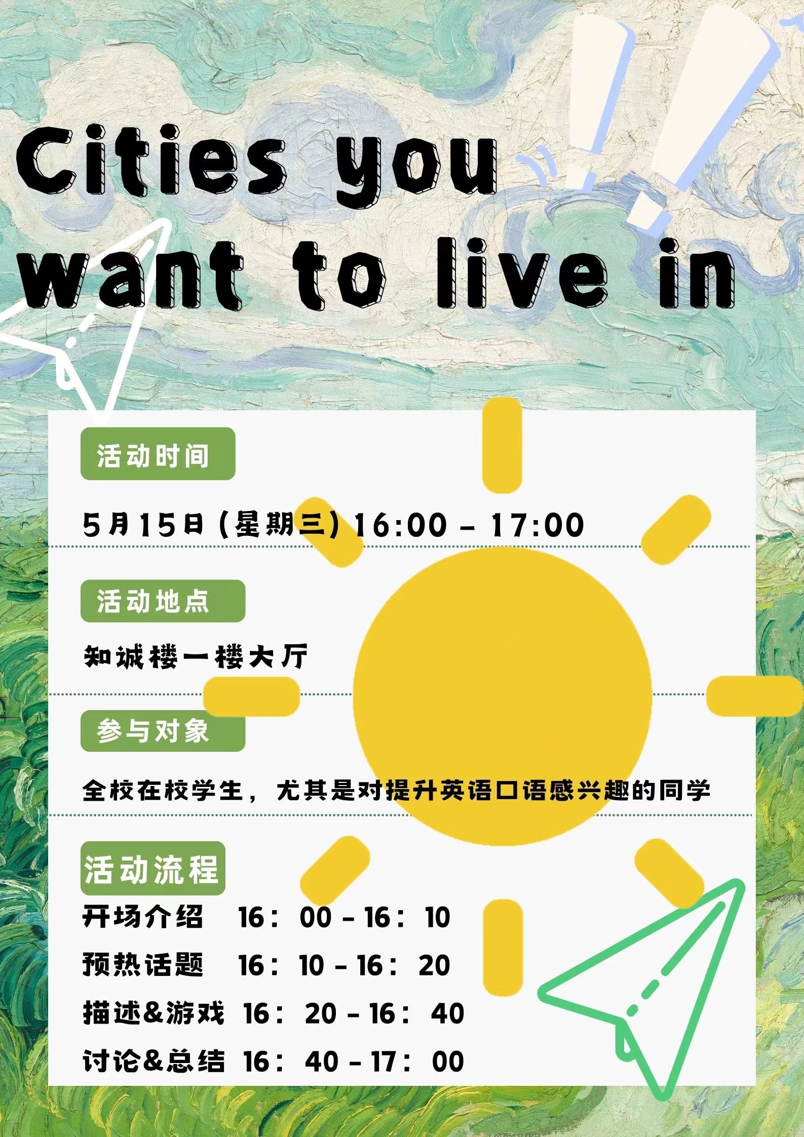 提及理想中的生活城市,你会从哪些角度去选择呢?地理位置?当地气候?基础设施?人文景观等?在选择和用英语描述未来你想生活的理想城市时,我们可以从哪些独特的角度去考虑与阐述,使用什么样的口语表达方式呢?本次英语角口语活动,我们将围绕“理想生活城市”这一主题,带领同学们循序渐进,深入挖掘与探讨大家理想中的生活城市之貌,找到梦之归处!