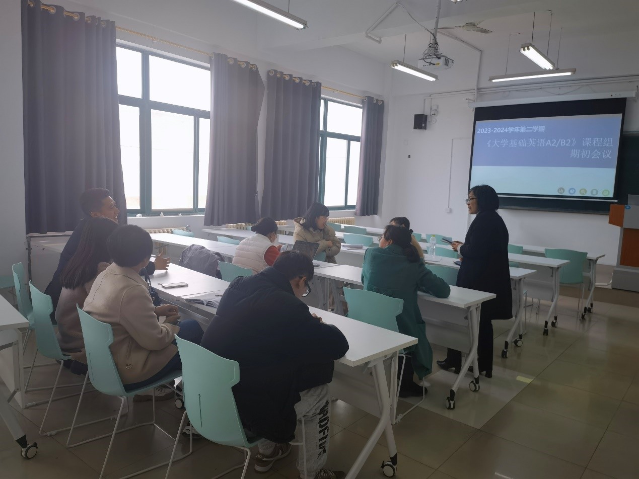 为进一步强化教学秩序,推动课程思政理念落实,促进教师专业发展,努力打造一支观念新、能力强、方法多、境界高的优质教师队伍,保障新学期各项教学工作平稳有序推进,3月13日下午两点半,外语系《大学基础英语A2、B2》课程组在知诚楼407召开了期初教学工作会议。会议由课程组负责人孟岩梅老师主持,课程组全体无课教师参加。