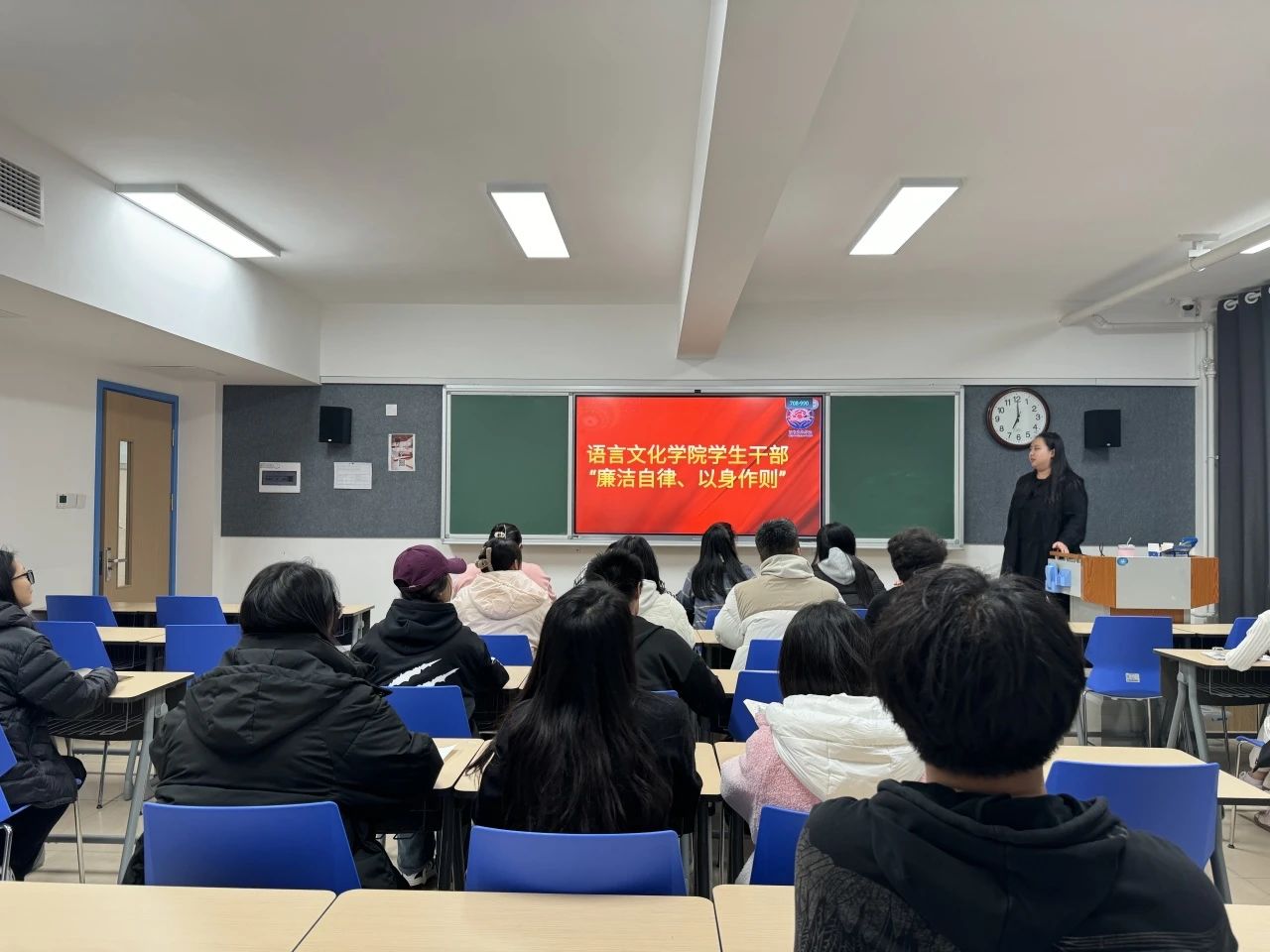 为了加强院学生会及综合事务中心的廉洁作风建设,规范学生干部在各类活动中的行为,杜绝不正当操作;为了明确第二课堂相关工作流程与职责,以保障校园管理工作的公正、有序开展,维护良好的校园秩序与环境,2024年11月25日,语言文化学院于知新楼613室召开“廉洁自律,以身作则”干部例会,团总支书记郭潇雨,院学生会及综合事务中心干部出席本次会议。