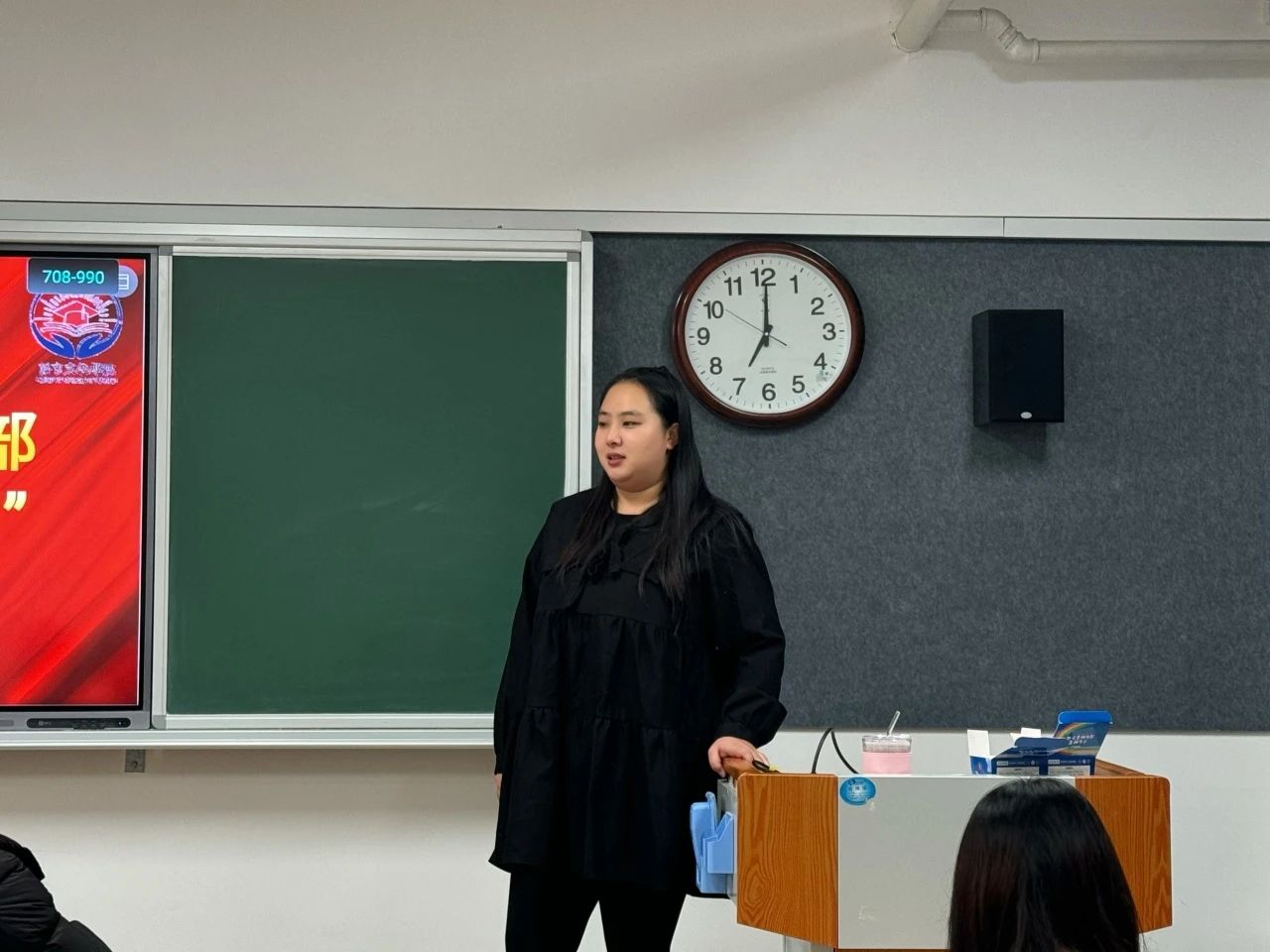 紧接着,学生会主席齐馨瑞上台发表讲话。她再次强调了学院廉洁作风建设的必要性与重要性。同时,她说明了第二课堂的相关事宜并明确阐释了任务分配。其一,组织部承担着活动的录取、签到以及发分等重要职责,各部门对此需有清晰认知,并且在每次活动结束后,必须及时将参加活动的人员名单准确无误地发送给组织部的对接干事。其二,鉴于校里第二课堂工作可能面临改革,其积分和名额认定标准将会有所变动,部分活动也将暂停开展,待相关标准确定之后,会第一时间发布至干部群内以供知晓。
