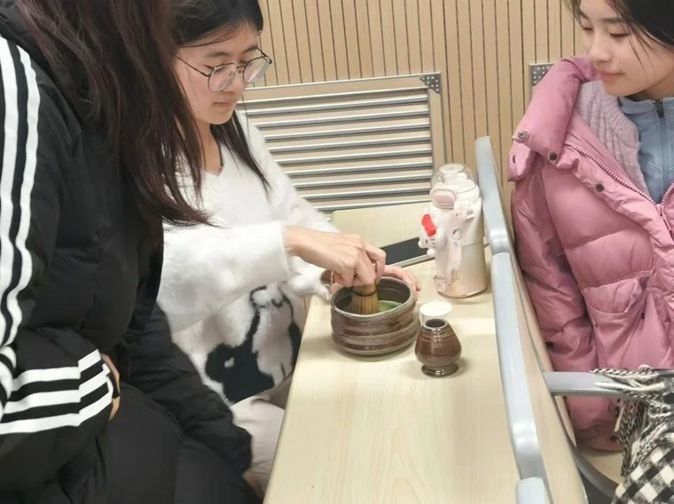 在抹茶制作过程中,老师们不仅耐心地指导每一位同学如何正确使用茶筅搅拌抹茶,还细心地帮助大家处理清洗茶具产生的废水。这一环节不仅体现了日本茶道中对细节的关注,也让同学们深刻体会到了环保的重要性。