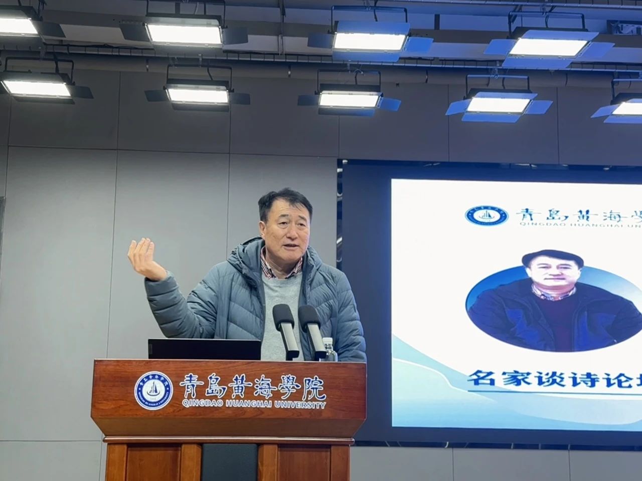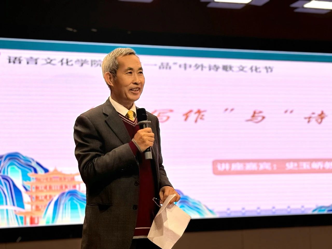 接着,青岛大学史玉峤教授带来了题为《“微写作”与“诗意人生”》的讲座。史教授从日常小事谈起,通过丰富的实例,展示了微写作的多样性。他强调,诗意并非遥不可及的阳春白雪,而是蕴藏在平凡生活中的细腻情感与对世界的温柔凝视。讲座的最后,他祝同学们人生有成,学业顺利,所遇皆安。每一位同学的心中都种下了一颗文字与生命交融的种子。这颗种子将在未来的日子里生根发芽,茁壮成长,促使同学们在文字与生命的永恒舞蹈中,追寻意义,创造价值,拥抱更加美好的精神世界。