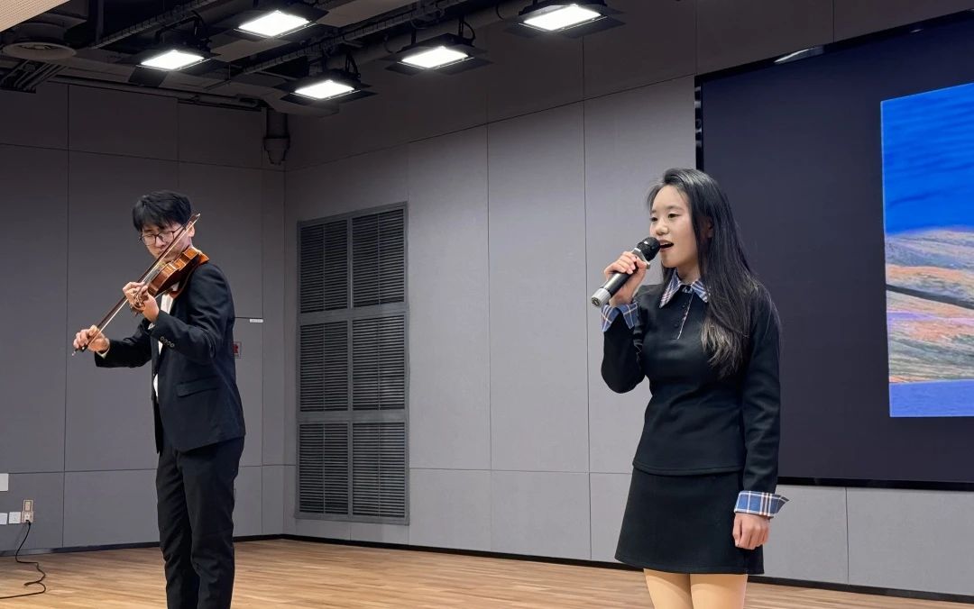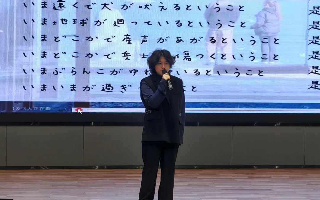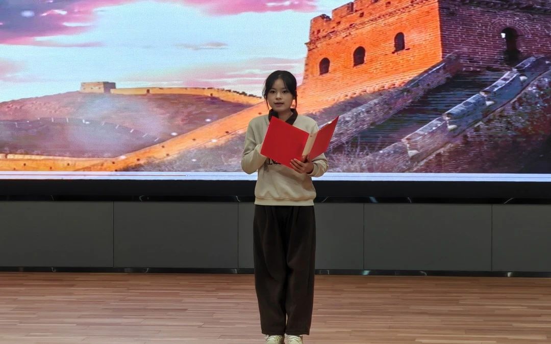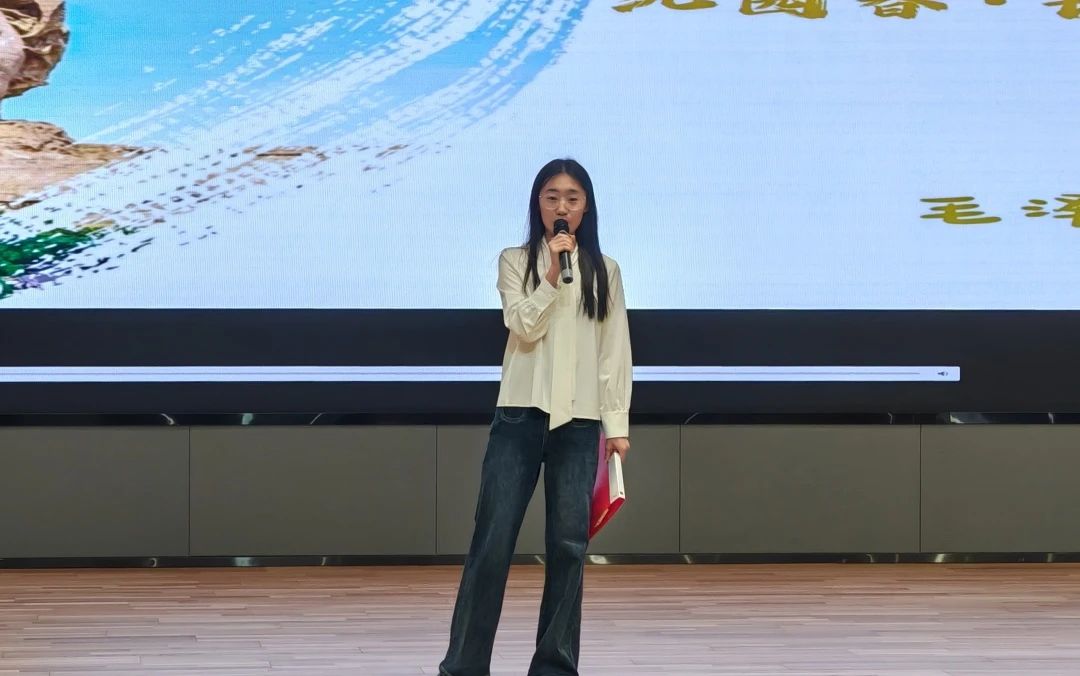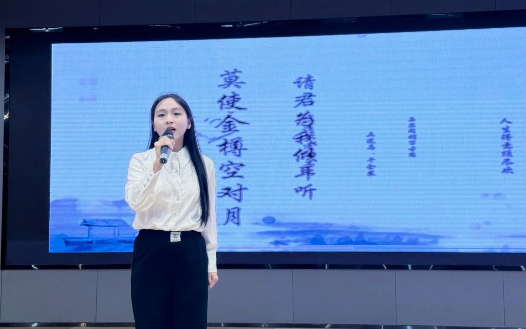 刘宏孝同学《将进酒》的朗诵,感受李白那狂放不羁的灵魂,汲取那份穿越千年而来的精神力量。唐文静同学朗诵的《北飞的候鸟》,蕴含着对生活的无奈与坚韧,对爱情的渴望与失落,对未来的迷茫与憧憬。石琦滟同学的朗诵《祖国,或以梦为马》,是一首献给祖国的深情赞歌,也是对理想与信念的炽热呐喊。王馨然同学带来的《月光下的中国》诗朗诵中的月光,不仅是自然的恩赐,更是一种情感的纽带,凝聚着对祖国深深的眷恋与热爱。在方蕊同学朗诵的《将进酒》中,我们被诗人对自由与理想的不懈追求所鼓舞,被中华传统文化的深厚底蕴所折服。吕佳盈同学用日语朗诵《活着》,宛如一面镜子,映射出生活中的喜怒哀乐、悲欢离合,感受到语言背后所承载的文化底蕴与情感力量。冯婉茹同学的朗诵《翻过那座遥远的山》,勾勒出对远方理想的不懈追寻。在音韵的起伏中,领悟挑战与希望交织的生命旋律。李舒心同学朗诵的《我用什么才能留住你》中,灵魂深处对情感归依的苦苦探寻,使人沉浸于这直抵人心的诗意倾诉,邂逅一场触动心弦的精神共振。刘子艺同学的英文朗诵《Onward and Upward》中,传递着勇往直前、不断攀升的精神力量,于词句间坚定信念,汲取奋进勇气。刁春彤同学的中英双语朗诵《沁园春·长沙》为这首经典注入全新的活力,让听众仿佛置身于湘江之畔,感受那猎猎秋风与奔腾江水的磅礴气势。井翱然同学朗诵的《致橡树》,以深情且庄重之声,细腻演绎诗中的坚韧与柔情。刘铭扬的俄语朗诵普希金诗二首《生命的驿车》《假如生活欺骗了你》,让普希金的诗韵跨越时空,化作心灵的慰藉与前行的力量。
