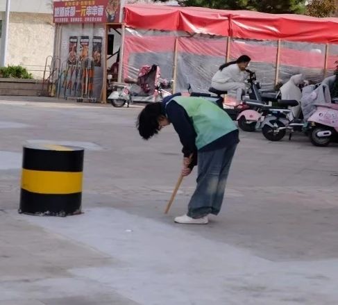本次活动的志愿者们身穿统一的志愿服,手持着卫生清理工具,在校园外的路口道边俯下身清捡着道路上人们随手丢弃的烟头。
