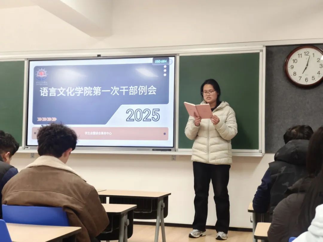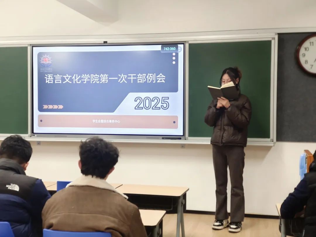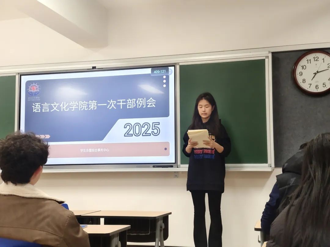 2025年3月4日晚,语言文化学院新学期第一次干部例会在知新楼613教室顺利召开。学工主任陈祥德、团委学生会及综合事务中心主席团和各部门部长参加了此次会议。会议由语言文化学院学生会主席齐馨瑞主持。