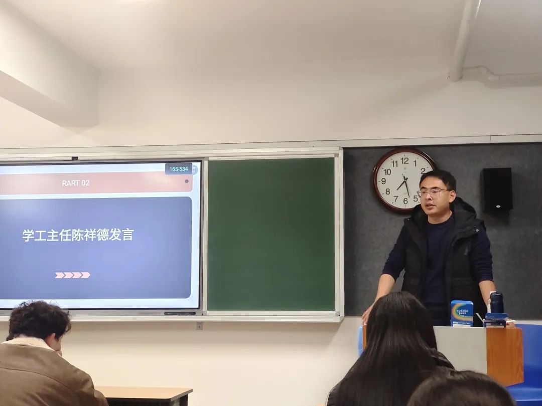 随后,学工主任陈祥德对新学期的工作提出了殷切期望。他指出,学生干部是学院形象的代表,在日常工作和生活中要时刻注意言行举止,做到礼貌待人、尊重师长、团结同学,展现出语言文化学院学子良好的精神风貌。他强调,学生干部要充分发挥桥梁纽带作用,积极服务同学,努力营造良好的学习氛围和校园文化环境。