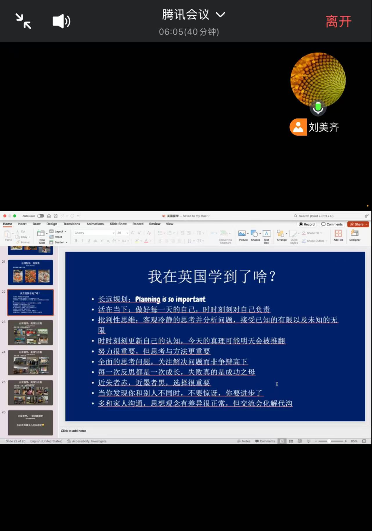 3月19日下午,语言文化学院举办了一场英国留学线上分享会。本次分享会主讲人是我院2024届优秀毕业学子——商务英语本科1班的刘美齐同学,带着他在英国利物浦大学的丰富经历与深刻感悟,与我们共同开启了一场跨越国界的梦想对话,为在场的每一位学子点亮了前行的灯塔。
