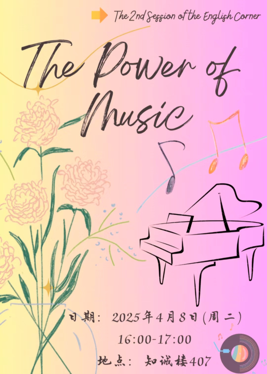 音乐不仅是一种娱乐方式,更是一种跨越文化的语言。在本学期第二次英语角中,我们将一起探讨The Power of Music(音乐的力量),无论你是音乐发烧友,还是只喜欢听歌,欢迎加入!