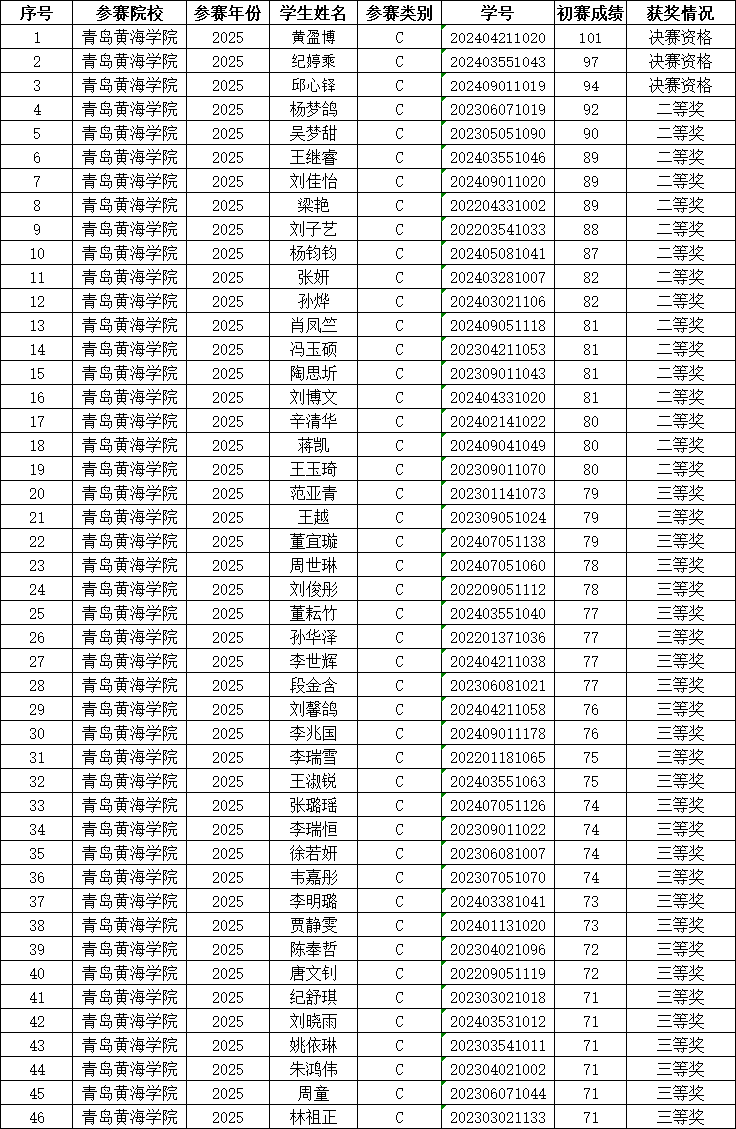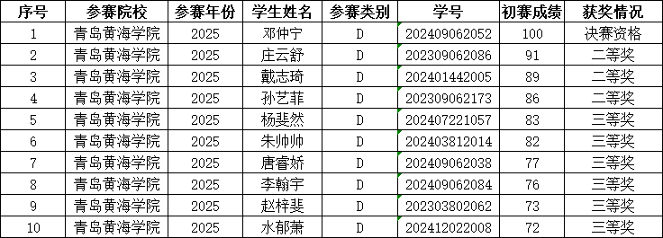根据竞赛初赛成绩及竞赛组委会规定的比赛奖项设定,我校共有4名同学获得2025年全国大学生英语竞赛决赛参赛资格,其中黄盈博、纪婷乘和邱心铎获得C类决赛资格,邓仲宁获得D类决赛资格。周欣和等55名同学分别获得本届竞赛各类比赛的二、三等奖(后附获奖名单)。