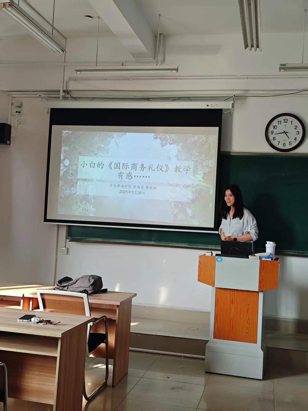 最后,曹晓玮老师分享了教授《国际商务礼仪》课程的心得,向老师们展示了肢体语言的独特魅力。曹老师通过展示课堂教学和英语角活动中师生手势变化的对比图片,让老师们深刻认识到手势在信息传递中的重要作用。她还呼吁老师们宽以待人、严以律己,在课堂上多采用手心向外的姿势与学生积极互动,并分享了许多实用的教学建议,为课堂教学注入新的活力。