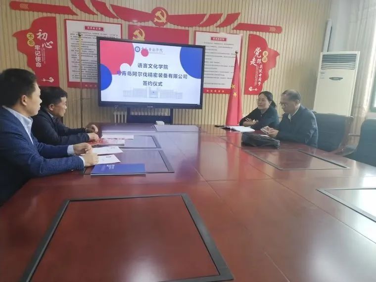 2024年11月1日下午2:30,语言文化学院副院长武学锋在知诚楼214会议室热情迎接来自于青岛阿尔伐精密装备有限公司李总和耿总的到来,并就校企合作事宜进行了愉快友好的交流。英语系系主任崔晓雷和企业联络人董成美老师出席了交流会。