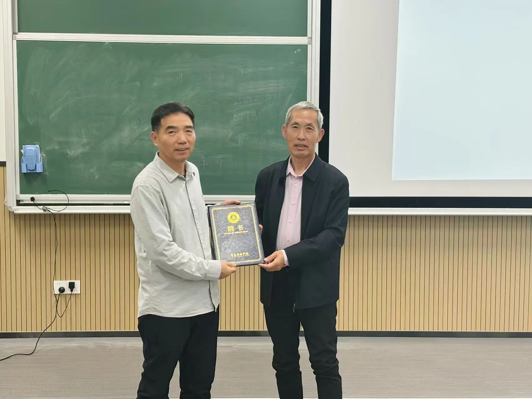 随后,语言文化学院院长刘中富教授向潘玉坤教授颁发了青岛黄海学院特聘教授证书。刘院长表示,希望借助潘教授的学术影响力和专业指导,进一步提升语言文化学院古汉语教学与研究水平,深化双方在中华优秀传统文化研究领域的合作交流。