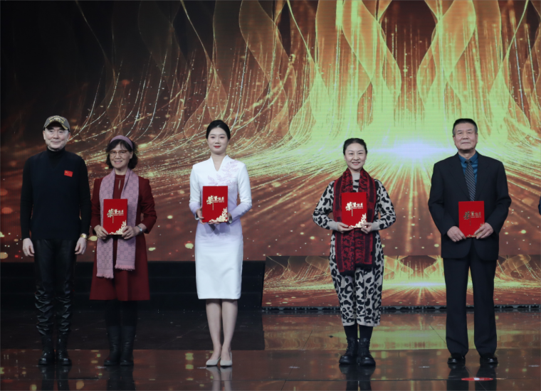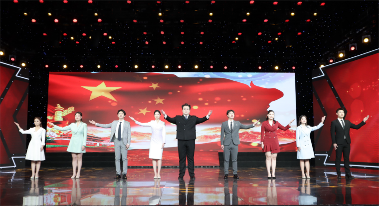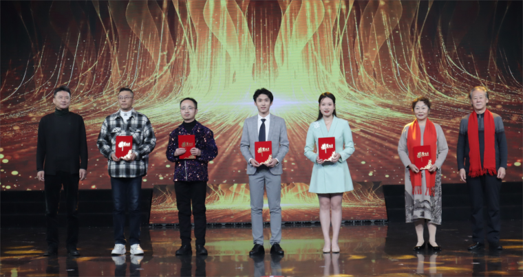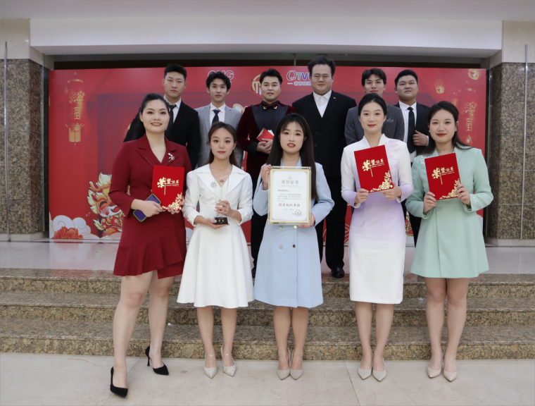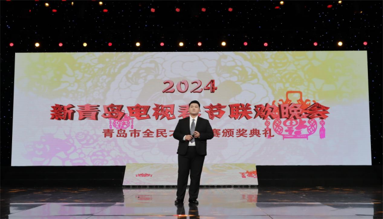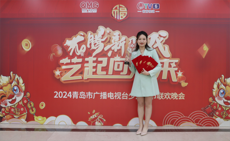 2024年1月22日,由青岛市广播电视台文创中心主办的“2024新青岛电视春节联欢晚会”暨“2023青岛市全民才艺大赛颁奖典礼”在青岛广播电视台明星大厅演播室录制。来自影视学院播音与主持系的集体朗诵节目《复兴颂》和独唱《海恋》成功登上2024新青岛电视春节联欢晚会,同学们的精彩表现受到现场观众的一致好评,播音与主持系的十位同学也是本届春晚中唯一的大学生团队。随着2024新青岛电视春节联欢晚会的成功录制,为期一年的2023青岛市全民才艺大赛也圆满收官。本年度才艺大赛,影视学院播音与主持系学子收获满满,2022级播音与主持专业的常焱哲、孙子珩、宁家爽、王宏韬、周桠凯、陈成璇、卢薇等九位同学带来的《复兴颂》获得最佳表演团队季军;2023级戏剧影视表演专业朱家绘同学的独唱《两地曲》获得最佳表演个人季军;另外播音系选报的朗诵节目《在中国大地上报道》、《吹号者》和独舞《小河淌水》分获优秀表演团队奖和优秀表演个人奖。本次颁奖典礼上,青岛黄海学院荣获优秀组织单位奖。