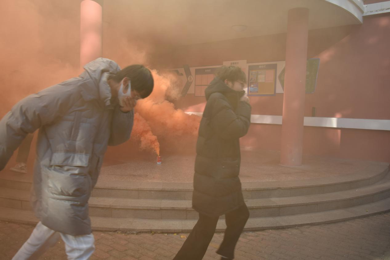 本次消防疏散演练为了增强火灾场景真实性,深度提升学生参与感,选择在学生宿舍楼内进行。演练开始前,各部门做好充分的准备,对相关工作人员、老师、学生引导员进行培训。演练正式开始后,各楼仿真火灾点位点烟,学生启动疏散流程。楼长第一时间开启消防广播,并打开电磁门。楼内各疏散口、楼梯口等重点区域的引导员迅速就位,引导学生使用湿毛巾捂住口鼻,弯腰低姿态沿疏散标识所示方向有序完成疏散。经演练,学生基本可以在规定的时间内完成疏散,未出现学生困在出口处或人员聚集踩踏等情况。