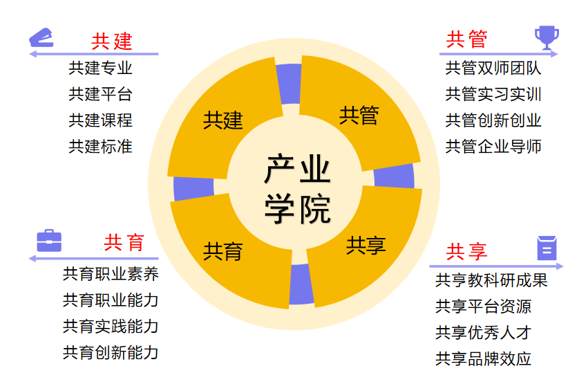产业学院在专业建设、课程建设、平台建设、人才培养、项目成果等方面实行“共建、共管、共育、共享”的四共管理模式,有效提升企业参与的热情与积极性,促进双方共赢提升。