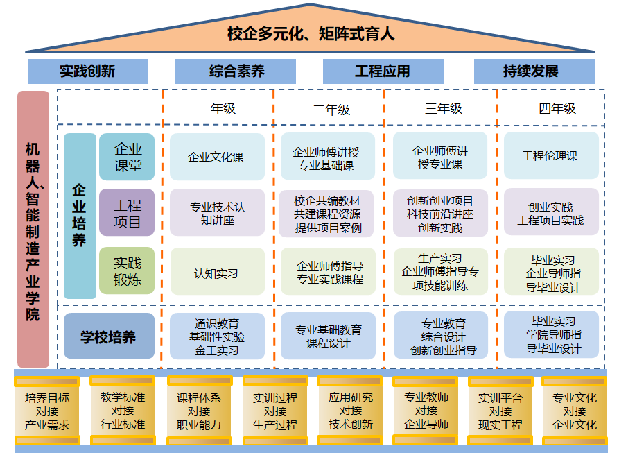 将人才培养标准和企业生产标准、岗位群标准全面对接,从传统的以知识为主线的培养模式转向以能力为主线的培养模式。实施“知识传授+能力培养+价值塑造”全方位协同育人;实施校企“平台共建、课程共创、师资共培、资源共用、过程共管、成果共享、责任共担、人才共育”全过程协同育人;实施“课程+项目、课堂+车间、实训+生产、教师+专家、专业文化+企业文化、应用研究+技术创新”全要素协同育人。开展产教融合“八个对接”,即培养目标与产业需求、教学标准与行业标准、课程体系与职业能力、实训过程与生产过程、应用研究与技术创新、专业教师与企业导师、实训平台与现实工程、专业文化与企业文化对接,夯实学生综合素养、实践创新、工程应用、持续发展四个基本能力,构筑了高素质应用型人才培养的“四梁八柱”。