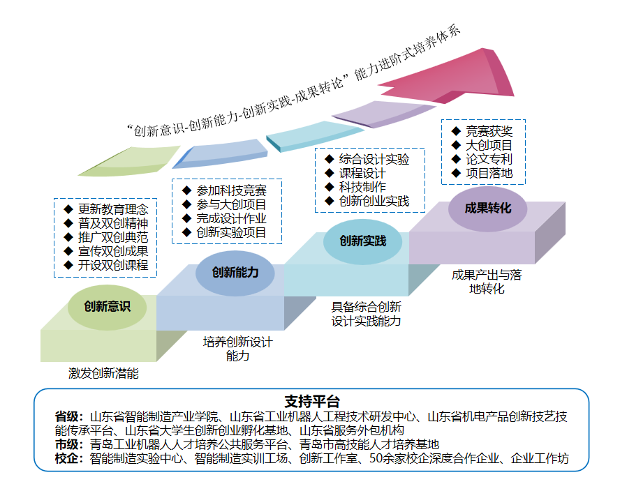 依托工业机器人工程技术研发中心、技艺技能传承平台等4个省级平台、工业机器人人才培养平台和高技能人才培养基地2个市级平台、智能制造实验中心、实训工场2个校内平台和30余家校外实习实训基地,建设“省-市-校企”三级人才培养实践平台。建立“学期小实践,学年大实践”的实践能力培养机制,构建并实施了“基础型+技能型+综合型+工程型”四阶层级递进实践教学体系,从简单到复杂、从基础到综合、从技能训练到工程应用,整体优化、层级递进,实现分阶段、进阶式实践能力培养,学生100%考取职业资格证书,提升了学生工程实践应用和解决复杂工程问题的能力。