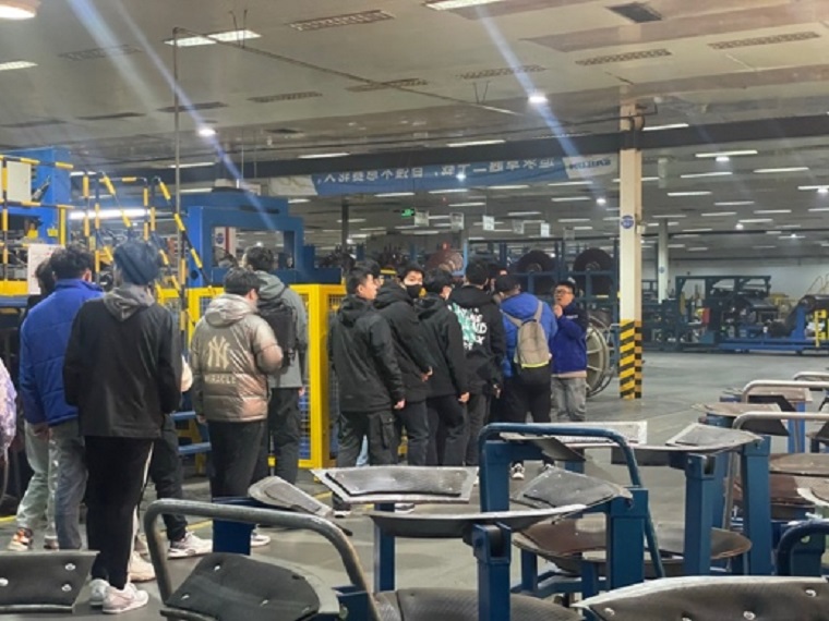 随后,在TBR品质技术部压出工程师付尚和成型工程师刘浩的带领下,学生到半钢产线和全钢产线的半成品、成型硫化车间参观了轮胎生产过程。车间的硫化气味较重,参观期间工程师全程强调注意安全。通过参观学生对生产工艺有了更全面的认识,感受到了轮胎成型机械的每个部件运动情况,对三维模型转化有了更深的印象。此外学生了解到,轮胎生产车间内主要有半钢一次和全钢二次法的成型机,在生产中如果有遇到问题,可以及时反映到软控各部门,这极大地方便了技术研发和生产管理。