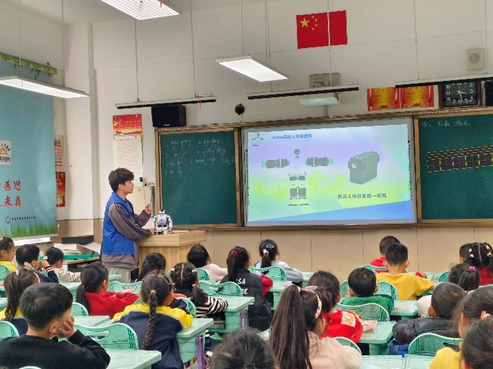 “同学们,你们知道什么是机器人吗?”课堂上,志愿者首先抛出了一个问题,立刻引发了孩子们的热烈讨论。有的孩子说机器人是像变形金刚一样的钢铁战士,有的孩子说机器人是能帮人类做家务的好帮手。志愿者们微笑着倾听着孩子们的奇思妙想,随后用通俗易懂的语言和生动形象的图片,向孩子们介绍了机器人的定义、发展历史、种类以及应用领域。