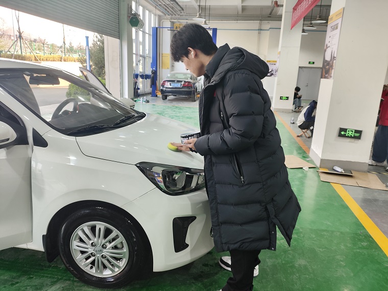 打蜡工序堪称一场技术与耐心的较量。同学们戴上手套,将优质车蜡均匀涂抹在车漆表面,再用抛光机或手工打蜡巾,以同心圆轨迹缓缓研磨。这要求力度均匀适中,既要保证车蜡充分渗透形成致密保护膜,提升车漆光泽度与耐久性,又不能因用力过猛造成车漆磨损。阳光下,打蜡后的车辆光彩夺目,如一件件精美的工艺品。