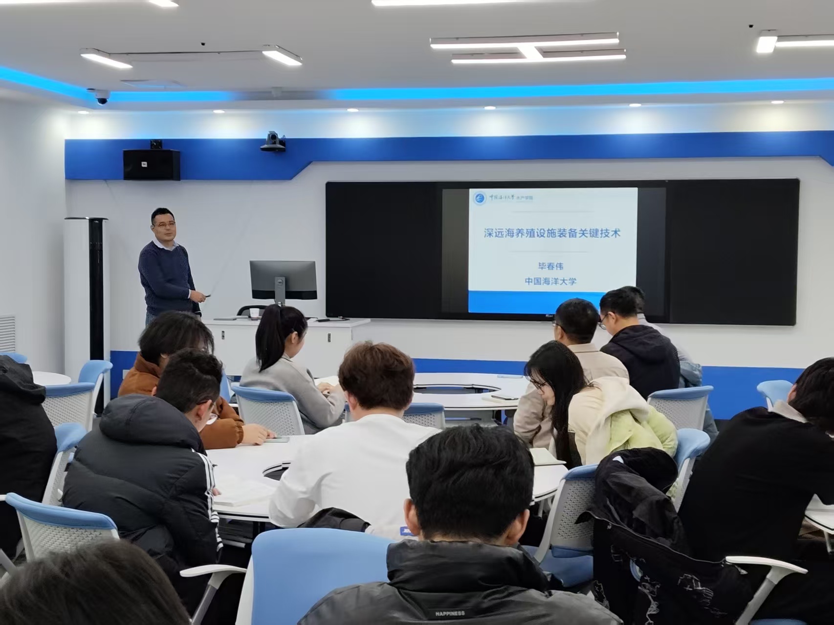 在题为《深远海养殖设施装备关键技术》的专题报告中,毕春伟教授结合其丰富的教学与科研经验,系统阐述了深远海养殖设施与养殖工程的研究方向、现状与发展趋势,并深入浅出地讲解了网箱物理模型试验方法、数值模拟分析技术、工程分析应用成效、污损生物影响分析技术、网箱养殖工程防灾减灾技术,以及深远海海上风机的研究背景、国际行业现状、团队研究基础和未来发展方向等内容。在互动环节中,师生踊跃提问,赵鑫教授就海洋污损影响因素与毕教授进行了深入交流,王超博士则针对养殖工程中若干技术路径的可行性进行了探讨。