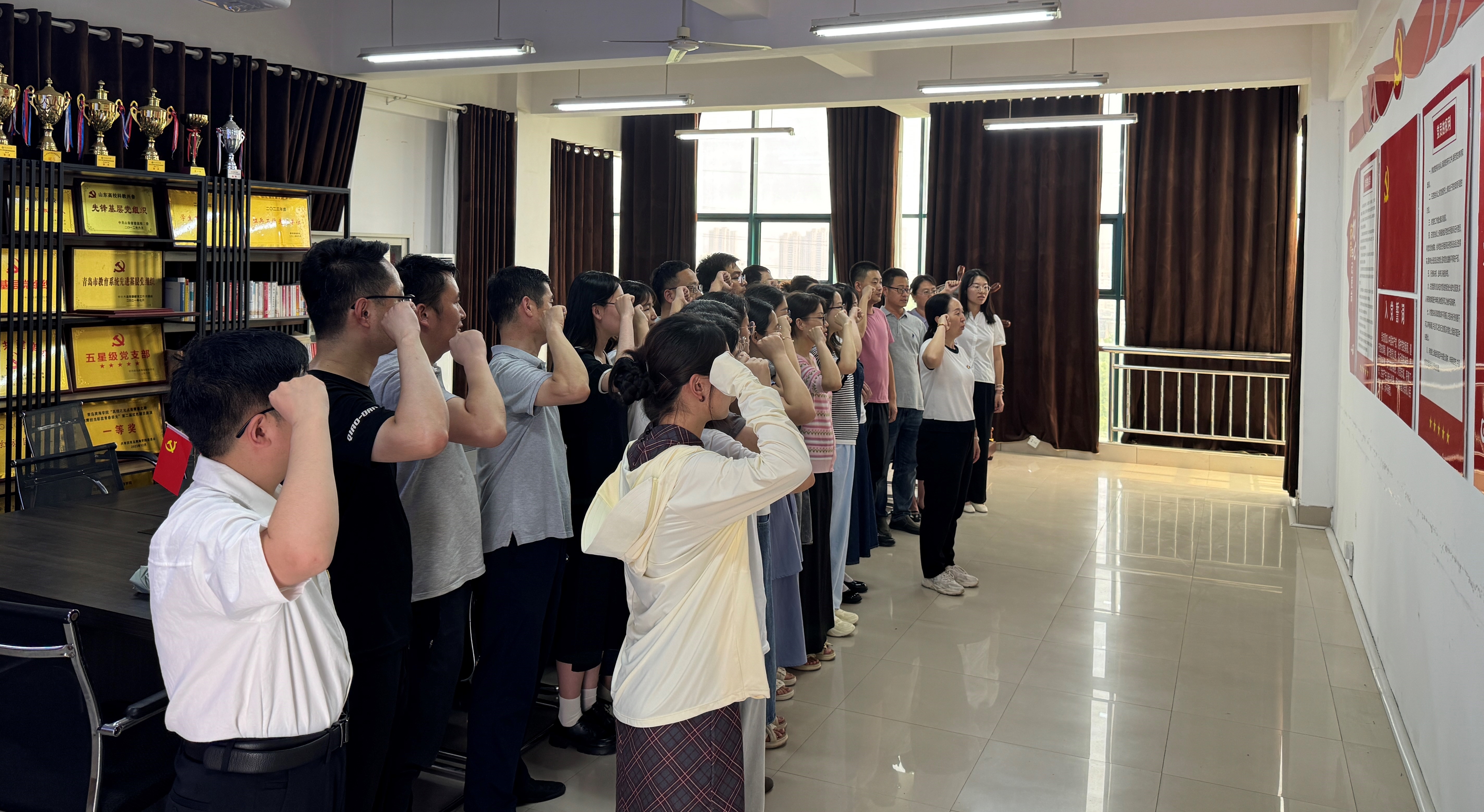 “我志愿加入中国共产党,拥护党的纲领,遵守党的章程……”铿锵有力的誓言回荡在各党支部活动现场。为庆祝建党104周年,学院各党支部组织党员同志庄重举行重温入党誓词活动。面对鲜红的党旗,全体党员高举右拳,庄严宣誓,再次感受入党时的庄严承诺和坚定决心,进一步增强了党员的身份意识、责任意识和使命意识。大家纷纷表示,将以此次重温誓词为契机,牢记初心使命,在本职岗位上担当作为,以实际行动践行对党的忠诚。